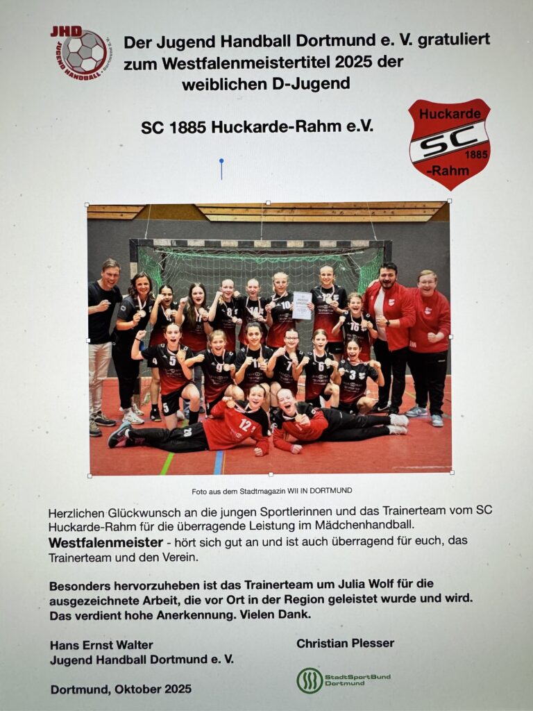 Die Ehrung der Mannschaft von Huckarde und der Trainerteams von Huckarde-Rahm und TV Asseln wurde von Christian Plesser vom Stadtsportbund Dortmund und Svitlana Shykina, ehemalige Nationalspielerin der Ukraine, vorgenommen. Thomas Schäfer übergab an Julia Wolf als Anerkennung für die herausragende Leistung in der Region und für den Dortmunder Handball im Jugend-/Mädchenhandball einen Blumenstrauß.